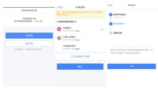 三、如果您有可申请的退税金额,按预填步骤顺序完成后静等入账(绑定的本人银行卡)即可。