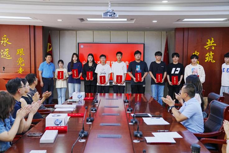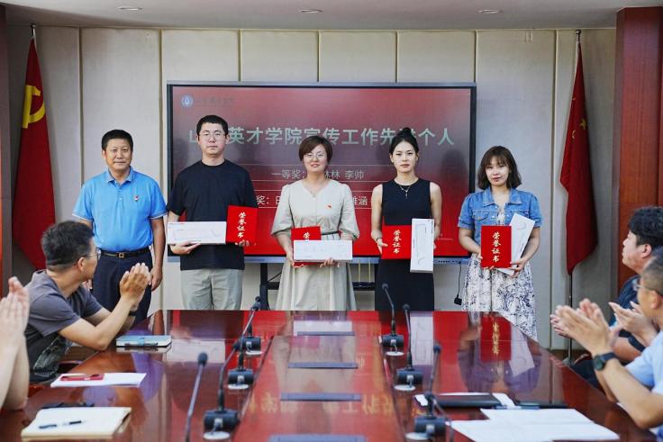李冰部长、余文千部长分别为2023—2024学年新闻宣传工作先进单位、先进个人、优秀学生记者颁发证书并合影留念,感谢老师、同学们对学校宣传报道工作的积极贡献。