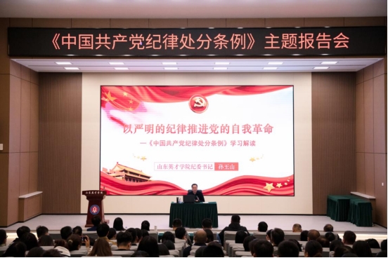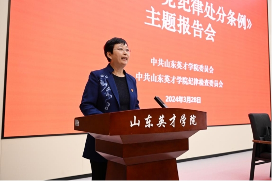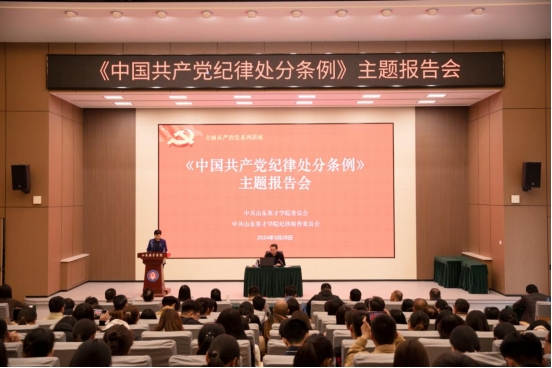 3月28日,学校党委、纪委举办了《中国共产党纪律处分条例》专题学习报告会。学校党委书记朱晓梅主持会议,就全面从严治党进行部署。学校纪委书记孙玉山同志作《以严明的纪律推进党的自我革命》主题报告。学校党政领导,各教学院(部)党总支(支部)班子成员、行政负责人、全体辅导员以及部分党员代表听取了报告。