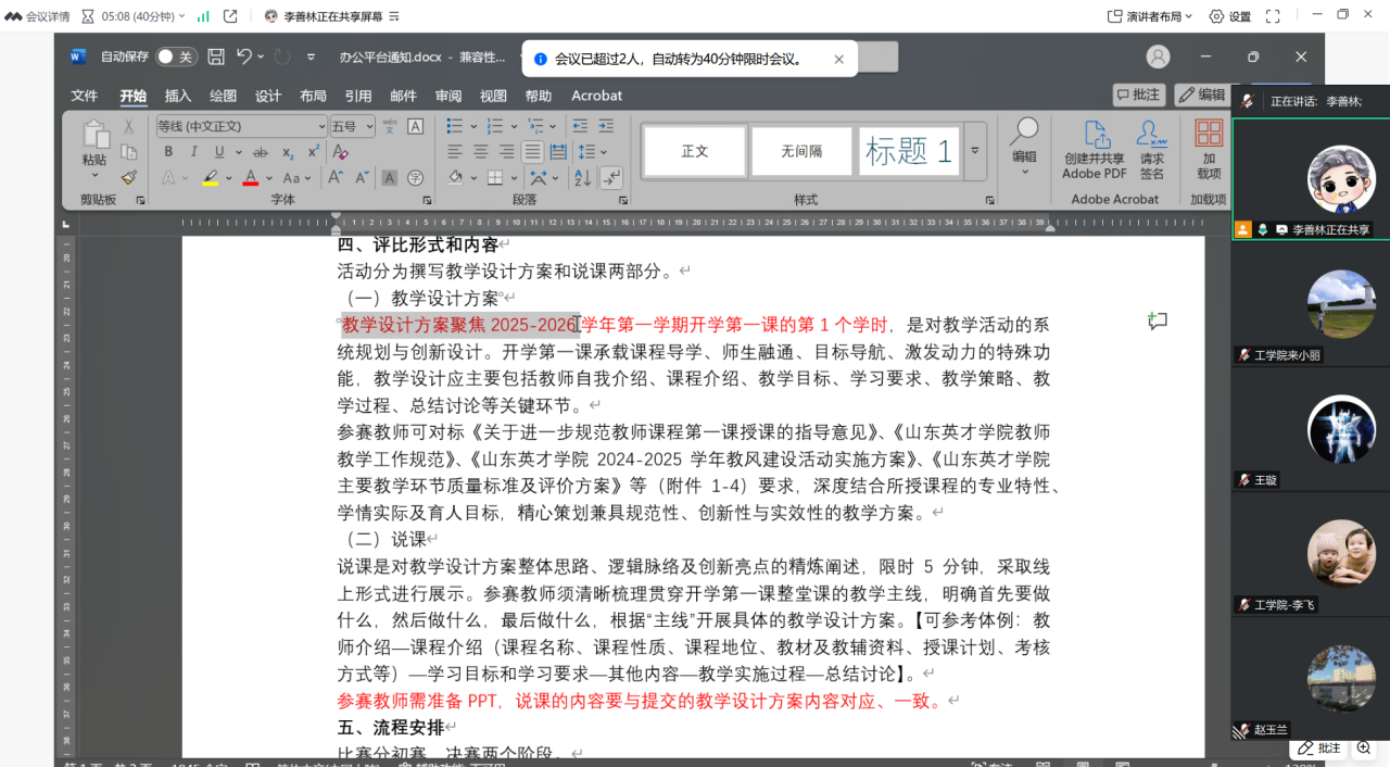 在活动伊始,工学院教学副院长平建对评审团进行了明确指导,指出“开学第一课”对于构建良好的师生互动关系、确立课程标准的重要性,并要求评委们秉持严谨专业的态度,选拔出具有示范性价值的教学设计,以树立后续教学的标准。院级督导李善林老师详细解读了评审标准,特别强调了创新性、实用性与育人价值的考察。在线说课环节,参赛教师纷纷展示了他们的教学才华。