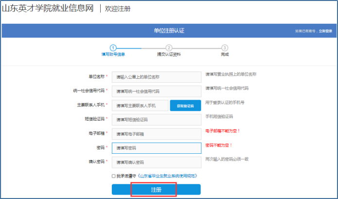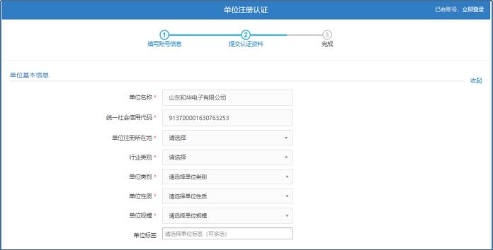 1、填写账号信息。系统会将单位注册填写的单位全名和统一社会信用代码与第三方系统数据核验,对联系人手机通过短信平台进行有效性验证,注册邮箱格式系统效验有效性。注册信息验证通过后进入下一步提交认证资料。