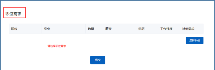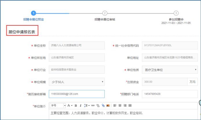 (二)按页面提示填写完善【展位申请报名表】和【职位需求】,完成后点击【提交】,即完成招聘会报名。