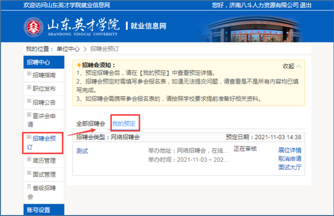 方法一:登录系统选择【招聘会预订】,查看【我的预定】中的审核状态及其展位号。