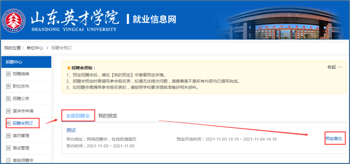 (一)使用账号密码登录学校网站,进入【招聘中心】;在招聘中心页面【招聘会预定】栏目中找到本次招聘会并点击【预定展位】,进入报名页面。