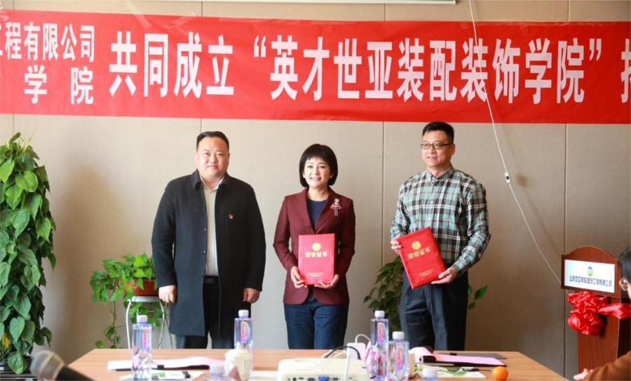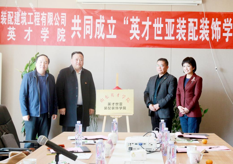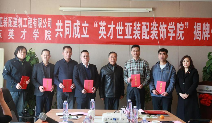 泰安市教科卫体委陈占峰主任参加了本次校企合作揭牌仪式,对双方校企合作给予肯定并表示热烈祝贺。“英才世亚装配装饰学院”的成立,实现了专业与产业的融合、学院建设与地方共同发展,增强了学生和企业间的双向选择,为泰安市校城融合、校企合作提供了典型案例,也是在泰安推广校企深度合作的范例,从而促进泰安乃至山东的区域经济发展。他希望校企双方能够携手积极探索新模式,充分发挥各自的优势,共谋美好未来。