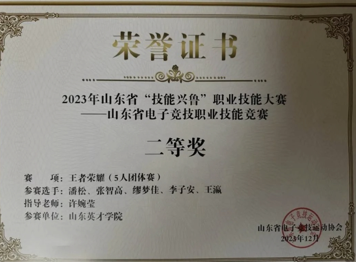 近日,2023 年山东省“技能兴鲁”职业技能大赛山东省电子竞技职业技能竞赛正式落下帷幕,拉斯维加斯3499官网登录入口战队在王者荣耀(团体赛)荣获二等奖。