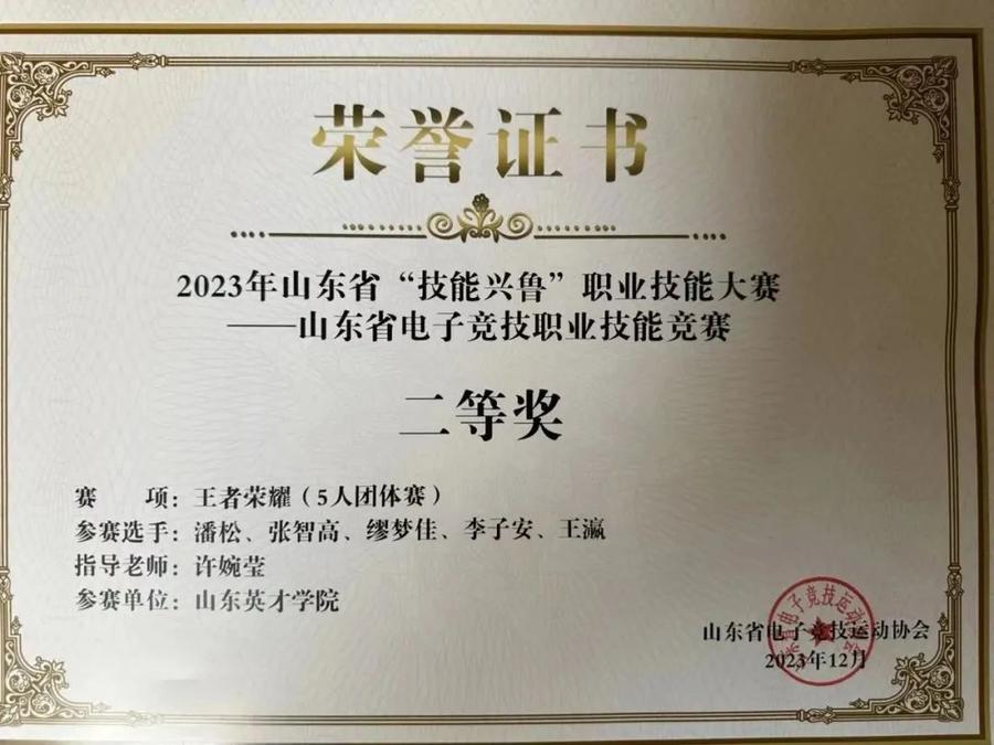 近日,2023 年山东省“技能兴鲁”职业技能大赛山东省电子竞技职业技能竞赛正式落下帷幕,拉斯维加斯3499官网登录入口战队在王者荣耀(团体赛)中荣获二等奖。