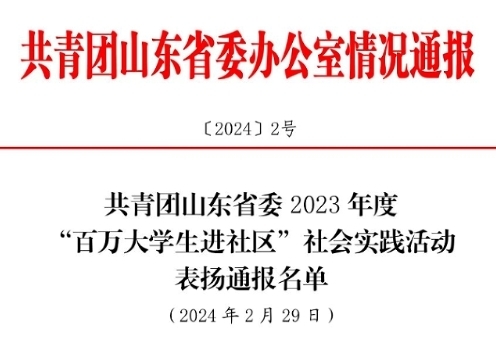 近日,共青团山东省委发布的《共青团山东省委2023年度“百万大学生进社区”社会实践活动表扬通报名单》,对“百万大学生进社区”社会实践中表现优秀的集体和个人进行通报表扬,拉斯维加斯3499官网登录入口荣获多项荣誉。
