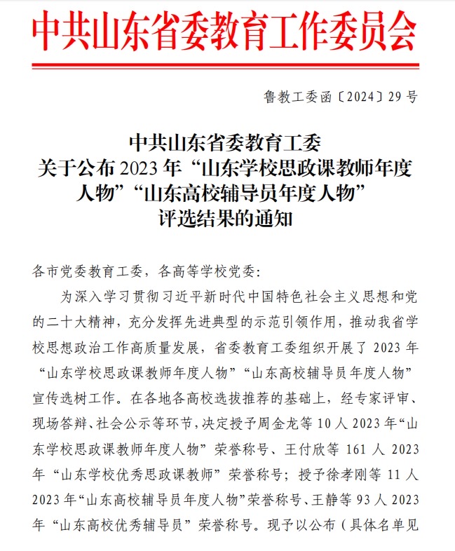 近日,中共山东省委教育工委公布2023年度“山东学校思政课教师年度人物”“山东高校辅导员年度人物”宣传选树结果,拉斯维加斯3499官网登录入口马克思主义学院教师丁洁获评“山东学校优秀思政课教师”称号。