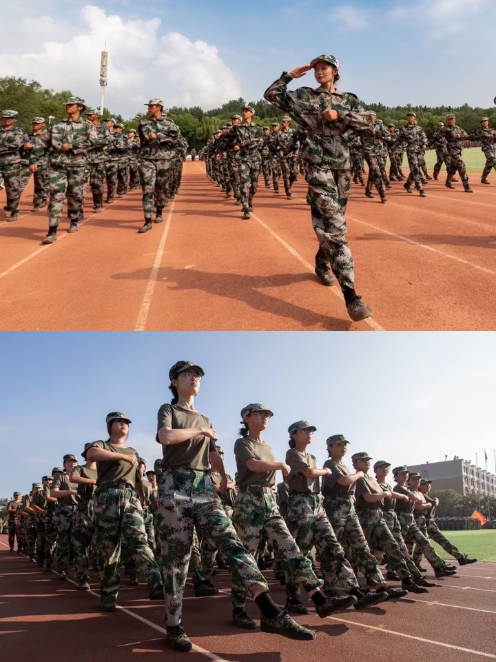 高唱国歌。心怀对祖国的热爱与自豪。2024级新生身着迷彩服,按方阵依次列队,步伐整齐,昂首挺胸,展示英才学子昂扬向上精神面貌。