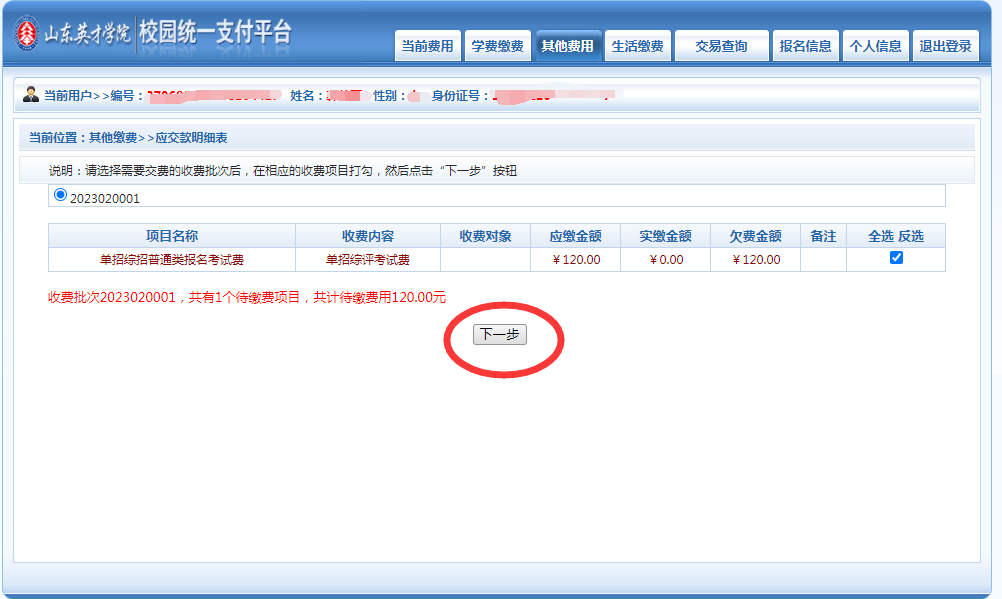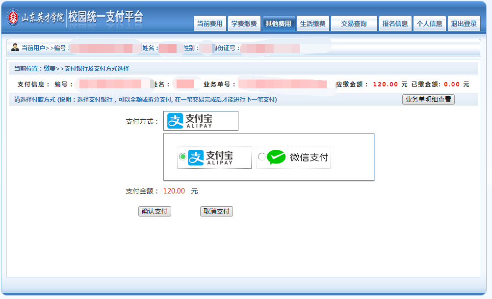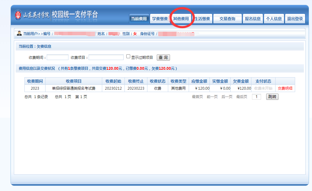 1、登录拉斯维加斯3499官网登录入口网站首页,点击浮动窗口,进入缴费端口,或输入网址http://pay.sdycu.edu.cn/。登录方式选择用户名一栏。用户名为考生身份证号,密码为考生身份证号后六位(或6个0)。综合评价、单招普通类考试费120元/人。退役军人考试费80元/人。