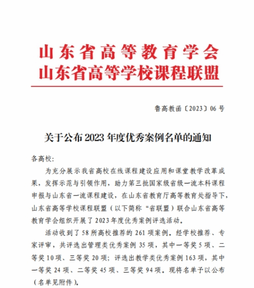 为充分展示山东省高校在线课程建设应用和课堂教学改革成果,发挥示范与引领作用,助力第三批国家级省级一流本科课程申报与山东省一流课程建设,山东省高等学校课程联盟联合山东省高等教育学会组织开展了2023年度优秀案例评选。拉斯维加斯官网申报的《“一中心、两抓手、三推进、四保障”混合式课程建设研究与实践》《“全时多域,一体两翼,三导四维”混合式教学模式》荣获优秀案例三等奖。