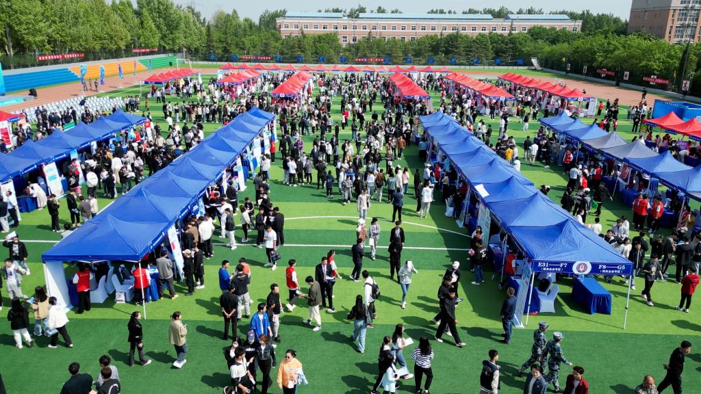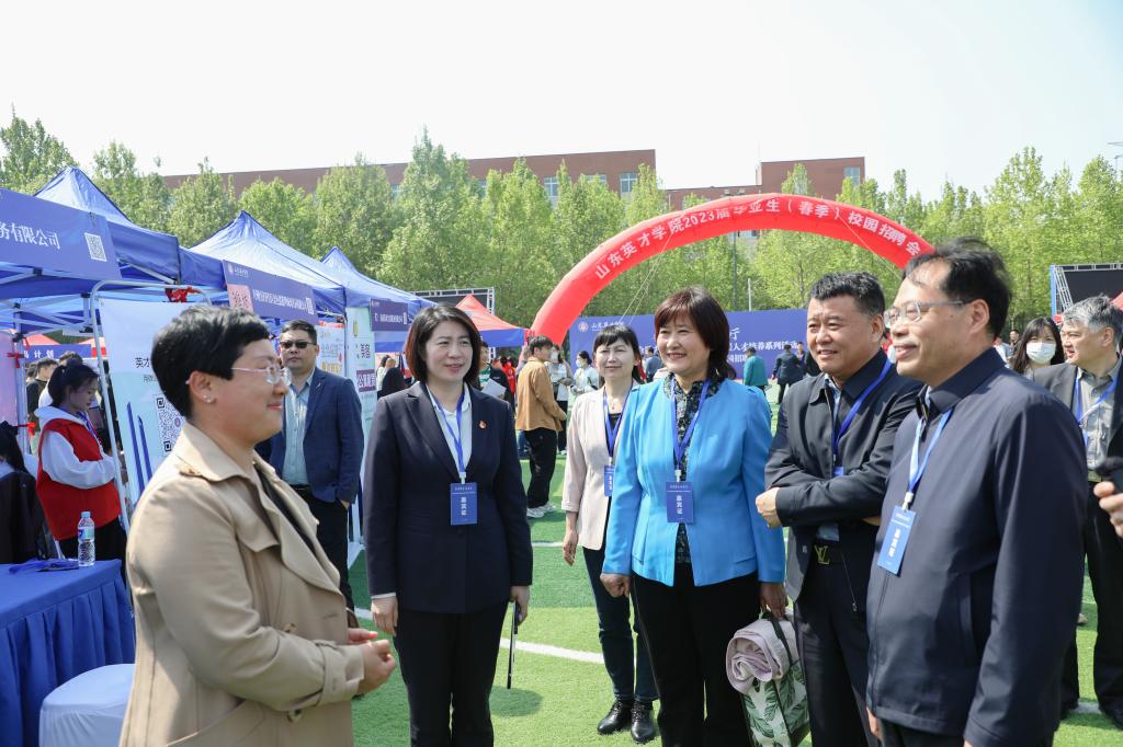 为深入贯彻落实科教兴国、人才强国、绿色低碳高质量发展战略,探索政校企协同机制,深化产教研融合发展,携手共促大学生就业创业。4月27日上午,由省工商联、省人社厅指导驻济高校、部分商(协)会共同组织开展的“齐鲁聚才会客厅” ——深化产教融合助力绿色低碳高质量发展人才培养系列活动启动仪式在拉斯维加斯3499官网登录入口田径场举行。启动仪式结束后,企业人才招聘会在学校田径场举行。山东省工商联副主席高洪岩,省人大常委、省人大教科文卫委员会副主任、山东省教育发展促进会专家委员会副主席王学爱,山东省工业和信息化厅产业人才处副处长朱沧洋,济南市教育局总督学马新东等省、市、区相关部门领导亲自来到会场视察指导工作。山东省教育发展服务中心党委委员、副主任孙培东宣布招聘会正式启幕。
