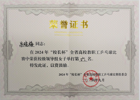 比赛中,朱晓梅书记稳扎稳打、连续作战、灵活多变,最终取得校级领导组女子单打第六名好成绩。5名参赛运动员团结协作、奋力拼搏,不畏强手、敢打敢拼,杜春茂、门梦琪带病坚持比赛,展现出了以球制胜、一“乒”到底的精神风貌和运动风采,充分诠释了学校干部职工积极进取、健康向上的良好精神风貌,学校代表队荣获混合团体比赛三等奖、优秀组织奖。