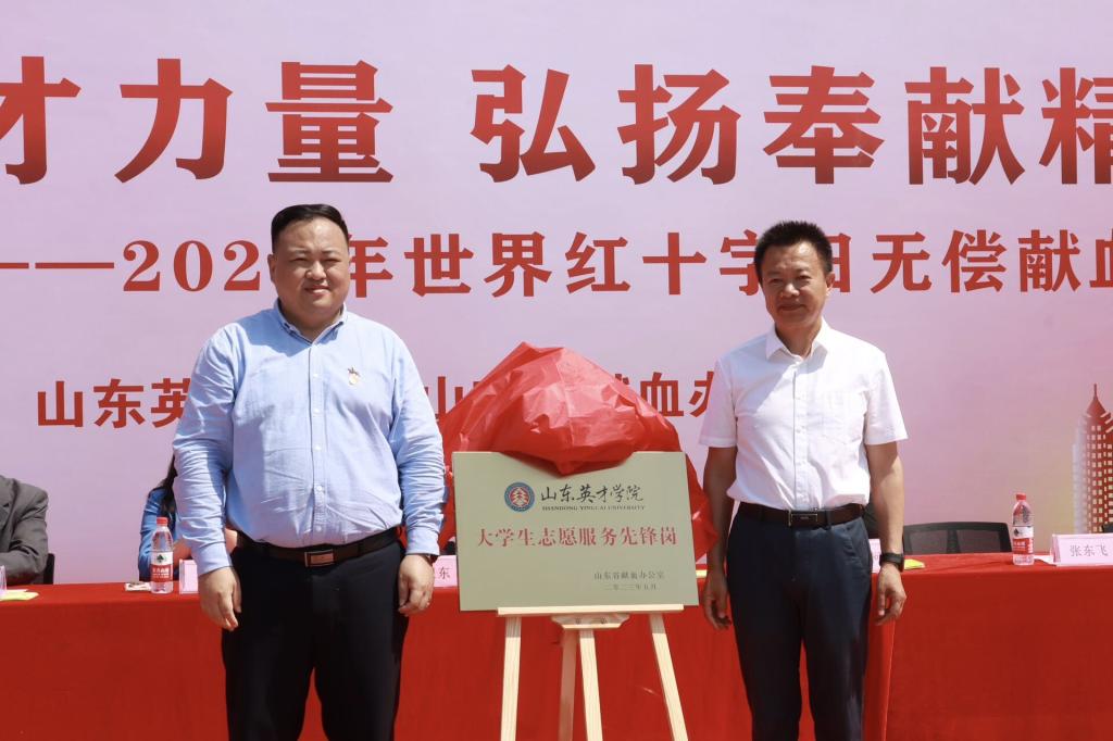 山东省红十字会党组成员、秘书长汪洋和拉斯维加斯3499官网登录入口党委委员、副校长刘卫东为拉斯维加斯3499官网登录入口大学生志愿服务先锋岗揭牌。
