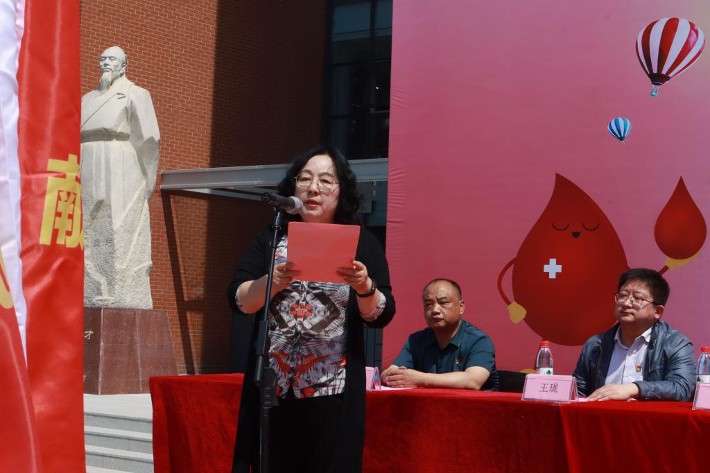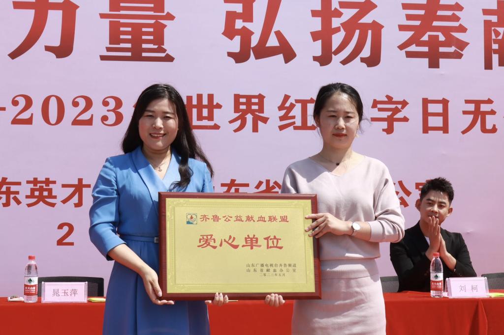 山东省乡村振兴基金会副秘书长、山东健康咨询网总编辑、齐鲁公益献血联盟副主席晁玉萍为学校颁发齐鲁公益献血联盟爱心单位奖牌。