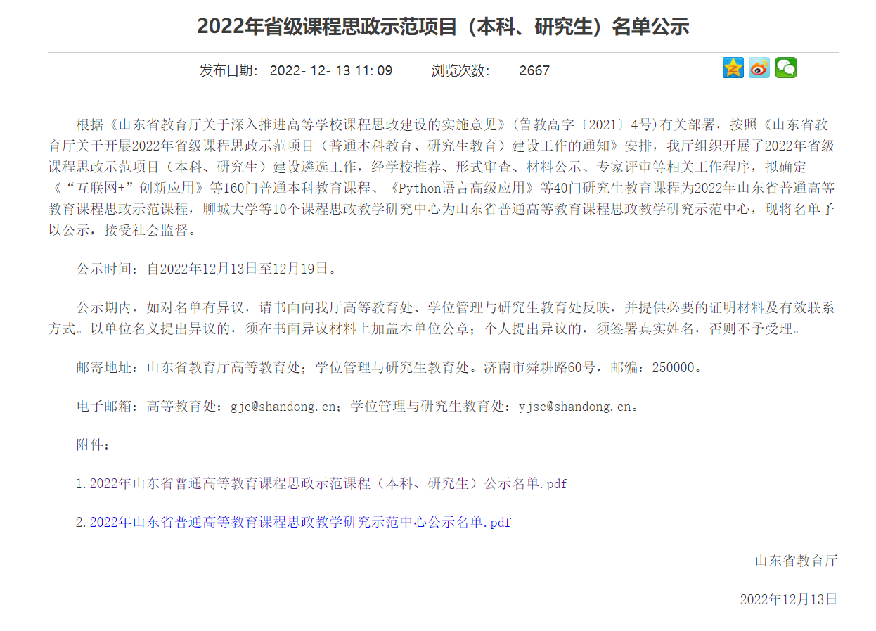 山东省课程思政示范项目是深入推进高等学校课程思政建设,落实立德树人根本任务,将思想政治教育贯穿人才培养体系的重要举措,旨在深入挖掘课程蕴含的思政教育资源,优化课程思政内容供给,形成较高水平的课程思政展示成果,发挥良好的示范辐射作用。本次全省共评选出普通本科教育课程思政示范课程160门、研究生教育课程思政示范课程40门、山东省普通高等教育课程思政教学研究示范中心10个。