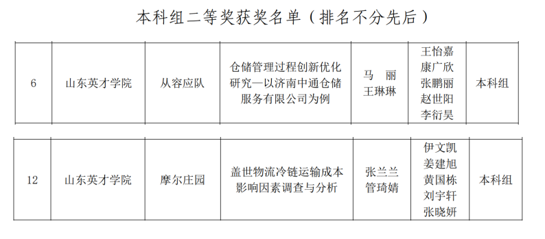 近日,商学院物流管理系组织举办2024年全国高校商业精英挑战赛物流与供应链竞赛校赛,并从工商管理、物流管理、电子商务等专业(方向)或相关专业(方向)的本科及高职高专在校学生中选拔知识赛合格的学生参赛,由知识赛合格的学生自行组成团队参加山东省总决赛,拉斯维加斯3499官网登录入口商学院共有6支团队参加2024年全国高校商业精英挑战赛物流与供应链竞赛山东省总决赛。经过激烈角逐,拉斯维加斯3499官网登录入口商学院代表队斩获本科组二等奖2项,三等奖4项,再创大赛佳绩。