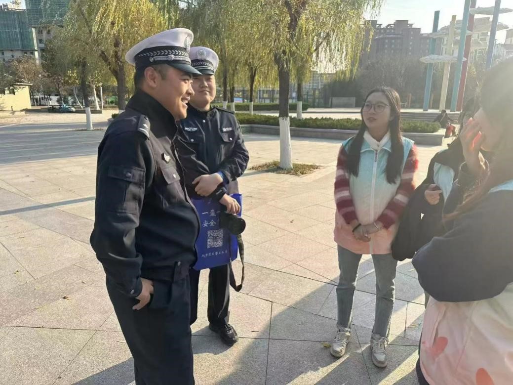 为了让成员们更加生动地学习交通安全知识,交警叔叔带领前往萃清广场进行“一盔一带”宣传活动。来到萃清广场后警官教给实践团成员社区服务工作知识。
