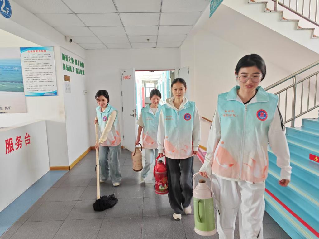 还有女生主动承担起接水送水的任务,她们脚步匆匆,往返于水房和各个房间,确保老人们随时都能喝到温热的水。