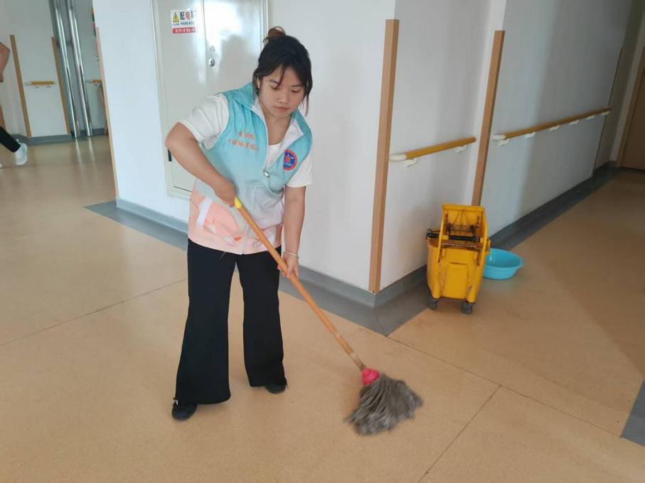活动开始,实践成员们分成小组进入养老院开始实践活动,实践成员们排队依次接过从养老院护工阿姨手中扫帚、拖布,抹布等工具,分组对养老院的一层公共区域和居住区域展开全面清理。实践成员开始对各自负责的区域进行仔细的打扫,确保没有一片污渍和一粒灰尘,为养老院的环境卫生贡献出自己的一份力量,保障老人生活在一个整洁舒适的地方。