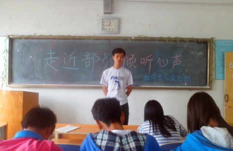 为了与部员彼此走近,互相了解,在他们中间传播正能量,注入一些新的思想,做好校学生会宣传部的工作,2013年9月23日11时30分,校学生会宣传部在D楼5010教室开展“走近部员,倾听心声”恳谈活动。校学生会宣传部部长吴文龙和校学生会宣传部部员们参加了恳谈活动。恳谈活动由吴文龙主持。