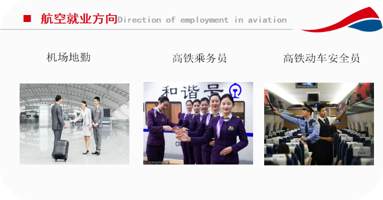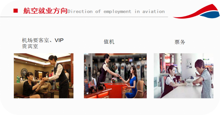 毕业生面向国际及国内各大航空公司从事飞机客舱服务岗位(空中乘务安全员、空中乘务员)、航空公司机场地面服务岗位、民航企事业单位或其他单位的相关岗位。