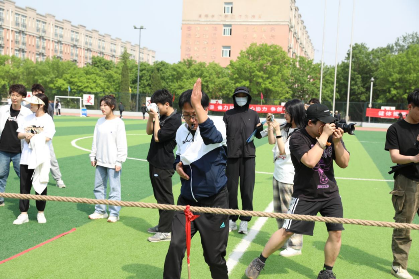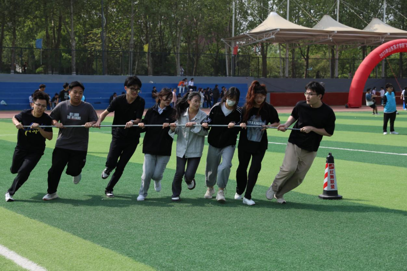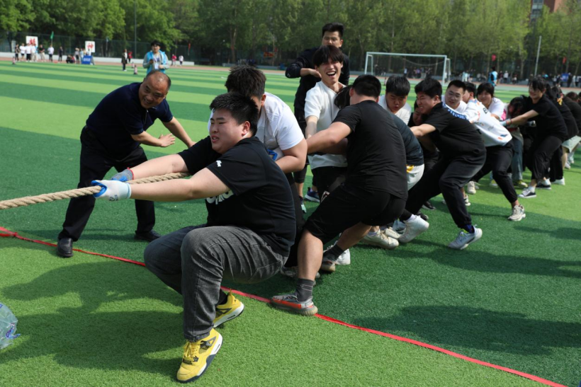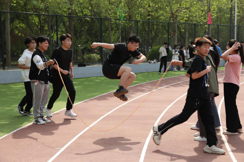 田径场内人头攒动,气氛热烈,体育嘉年华趣味项目包括拔河比赛、旋风跑、“摸石过河”、“两人三足”、跳绳(10人“8”字三分钟跳)、跳绳(4*30秒单摇接力)、跳绳(4*30双摇接力),近千名学生齐聚于此,共享体育运动带来的欢乐。