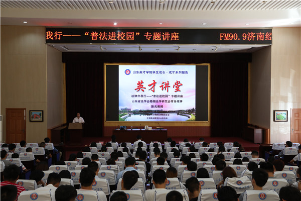 9月7日,山东省法学会婚姻法学研究会常务理事陈兆教授做客 “英才讲堂”,主讲了法律伴我行――“普法进校园”专题讲座。中华职业教育社山东分社孙大川秘书长、FM90.9济南经济广播《以案说法》普法讲堂主持人周硕、校学生工作处龙新良处长、孙玉山副处长及南校区300名师生参加了此次讲座,讲座由孙玉山副处长主持。