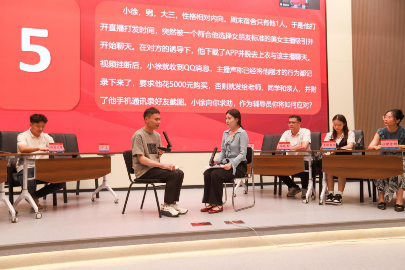 在案例实战演练中,每组主述人阐述案例基本情况,四位辅导员担任发布人回答问题,另外四位辅导员则化身学生、家长、媒体等身份进行提问。辅导员们全情投入,整个环节紧张有序,让观看者深受教育和启迪。点评嘉宾对案例和选手表现进行了深入细致的点评,高度肯定了辅导员们在活动中的精彩表现,并分享了自身工作经验,为今后进一步提升工作水平指明了方向。