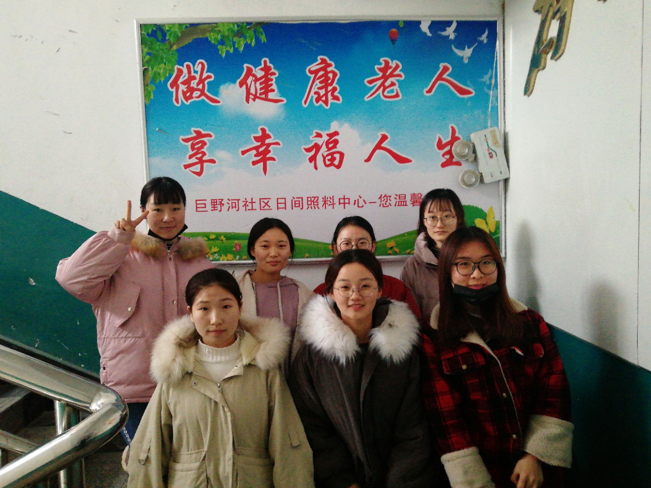 为响应学校号召大学生参加寒假社会实践活动,“爱出发”团队全体成员于2018年12月26日-2019年2019年1月1日,在济南市历城区巨野河街道的一个老年人日间照料中心开始了为期一周的社会实践活动,老年人日间照料中心是指为社区内生活不能完全自理、日常生活需要一定照料的半失能老年人提供膳食供应、个人照顾、保健康复、休闲娱乐等日间托养服务的设施。是一种适合半失能老年人的“白天入托接受照顾和参与活动,晚上回家享受家庭生活”的社区居家养老服务新模式。