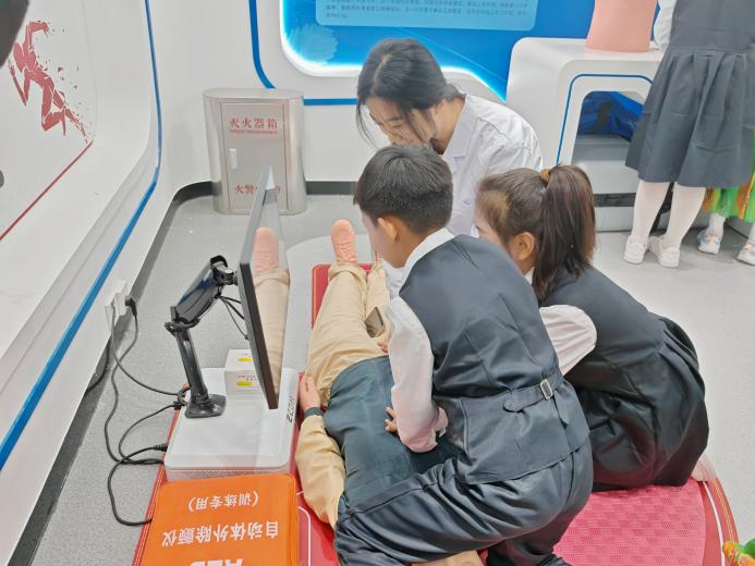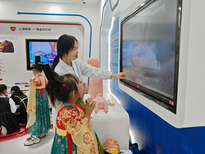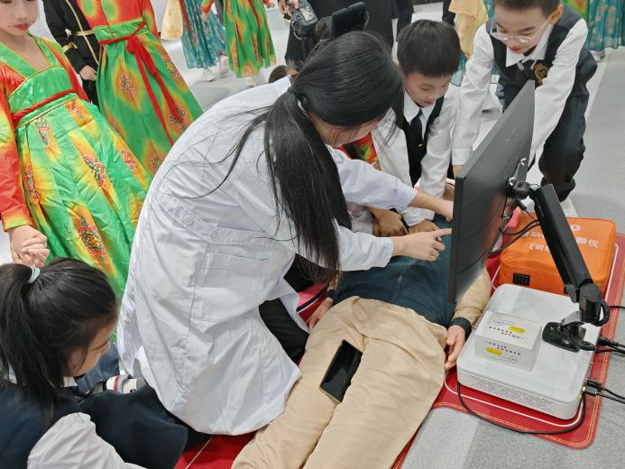 活动中,最令学生们印象深刻的是急救措施——心肺复苏的讲解与练习环节。生命科学馆讲解团成员董济茹同学以生动的语言和专业的演示,向学生们详细讲解了心肺复苏的重要性和操作步骤。随后,小朋友们进行了心肺复苏的模拟练习。用实践操作的教学方式,不仅让小朋友们了解心肺复苏的基本技能,也通过实践满足了他们的好奇心和求知欲。