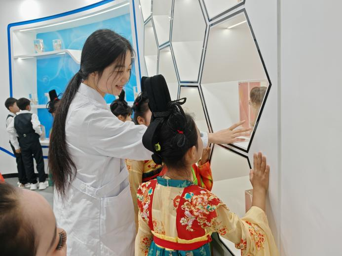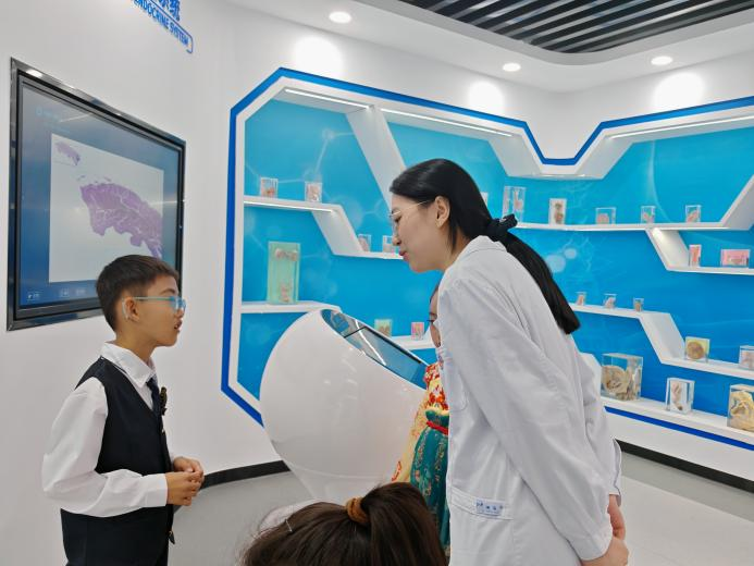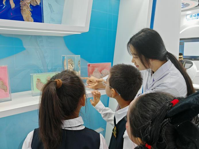 在胚胎发育展区,小朋友们被眼前的胚胎标本所吸引。他们观察着不同时期的月龄胎儿,感叹由受精卵到胚胎再到胎儿的奇妙变化。“小朋友们看到的展架上陈列的是最真实的胚胎标本,包含不同发育阶段的胎儿,这些标本极其珍贵”,生命科学馆讲解团成员董济茹为他们进行了专业的讲解与解答。
