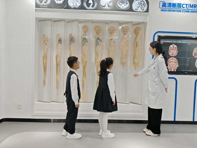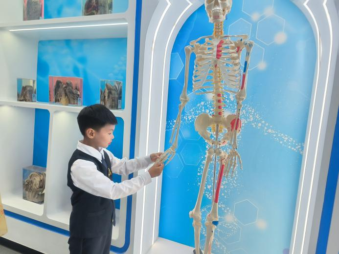 在精妙人体展区,学生们更是惊叹不已,他们不仅看到了人体各大系统的详细解剖模型,还通过数字化交互平台,了解了人体各个器官的功能和相互之间的联系。参观过程中,小朋友们表现出了极高的学习热情和好奇心。他们积极提问,讲解团成员和老师们积极的为大家进行解答,不断深入了解生命科学的奥秘。