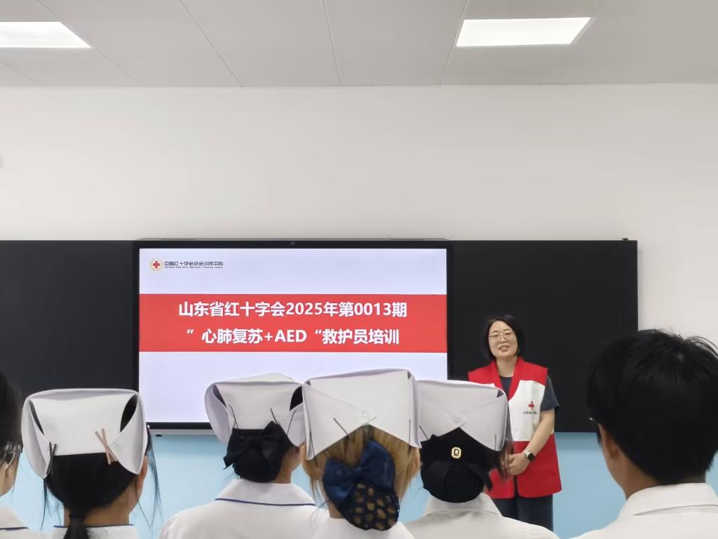 为增强医学院学生应急救护能力,弘扬“人道、博爱、奉献”的红十字精神,近日,由山东省红十字会主办、拉斯维加斯3499官网登录入口承办的2025年第0013期“心肺复苏+ AED”救护员培训顺利开展。夏淑娟、刘敏、高星星三位老师担任培训讲师,医学院护理专业2022 - 2024级的学生及两名教师共40人参与此次培训,系统学习“心肺复苏+ AED”的急救知识与技能。